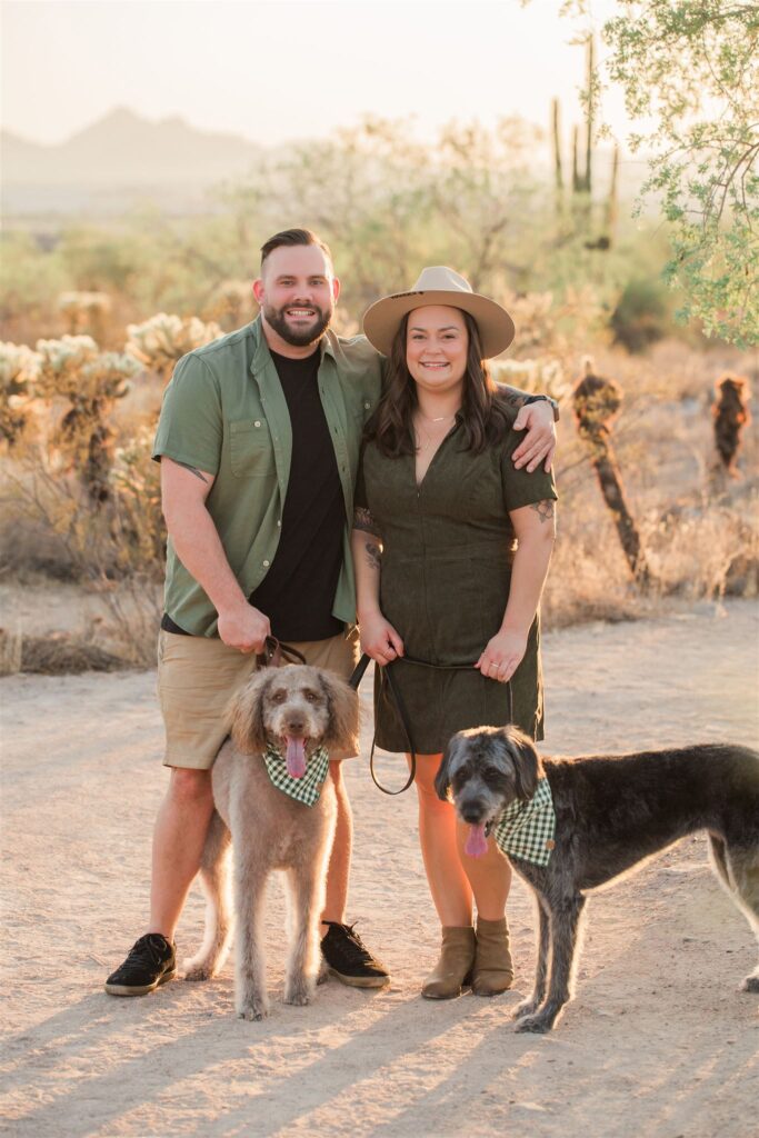 We timed the session perfectly to catch that dreamy Arizona sunset, with the soft golden light glowing across the desert landscape. The mix of beautiful desert scenery, playful pups, and this sweet couple made their fall mini session truly unforgettable!